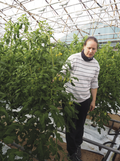 Tarhalla on jopa 25 erilaista tomaatin kokeilulajiketta. Kuvassa yrittäjä Emma Granö-Ring.