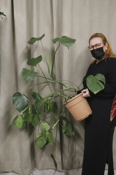 Kitta Ahroosin kädessä oleva peikonlehti on tyypillinen esimerkki kasvista, jonka asiakas tuo kunnostettavaksi. Se vaihdetaan uuteen multaan ja ruukkuun, leikataan ja tuetaan.