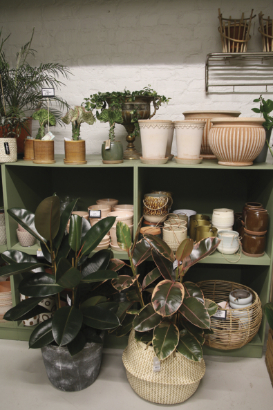 Ruukkuja ostetaan paljon. Myymälässä istutetaan pieni kasvi ostettuun ruukkuun odottaes¬sa. Kumiviikuna ’Belize’ on yksi esimerkki suosituista pinkkilehtisistä kasveista.